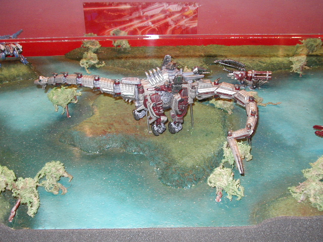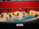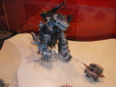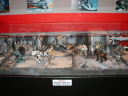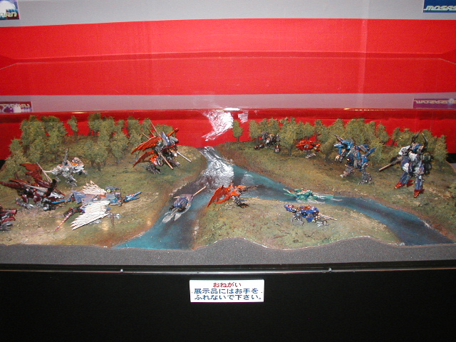 ゾイドの戦いの歴史から、名場面(?)、重要な戦闘のディオラマが展示されていました。旧ゾイドからは上記の写真の他ビガザウロを肇とする初期ゾイド群、ゴジュラス対レッドホーン、マッドサンダー対デスザウラー、Mk−II競争がありました。また、モニターでは旧ゾイドのCF(と思いますが昔のCFを目にした事がありませんので詳細不明)が流されていました。