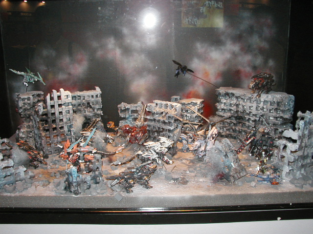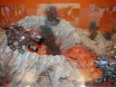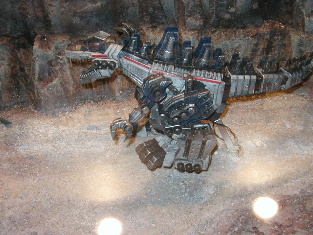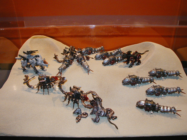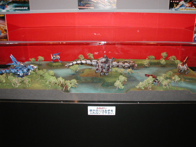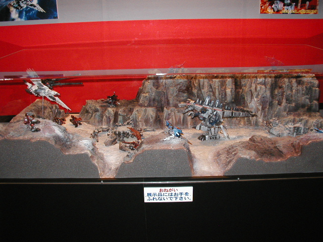 ゾイドの戦いの歴史から、名場面(?)、重要な戦闘のディオラマが展示されていました。旧ゾイドからは上記の写真の他ビガザウロを肇とする初期ゾイド群、ゴジュラス対レッドホーン、マッドサンダー対デスザウラー、Mk−II競争がありました。また、モニターでは旧ゾイドのCF(と思いますが昔のCFを目にした事がありませんので詳細不明)が流されていました。